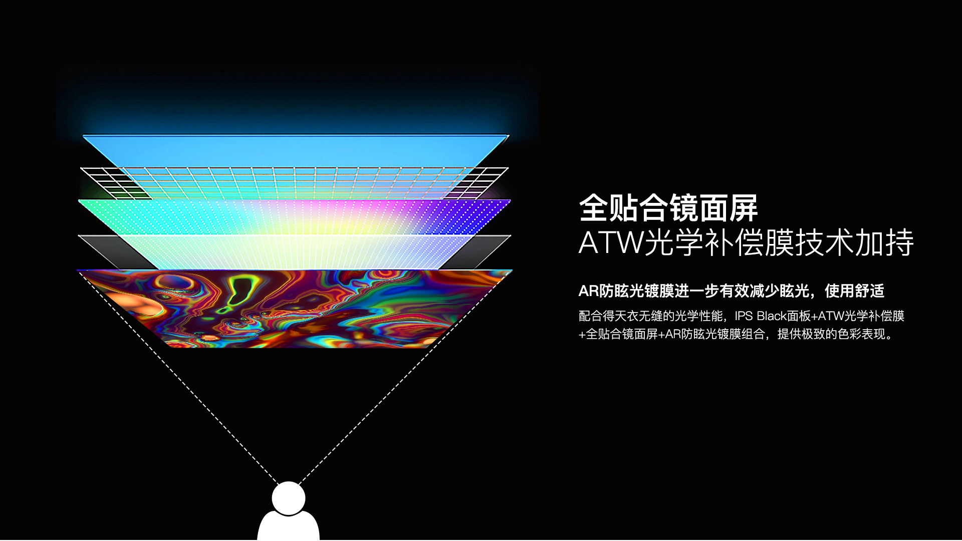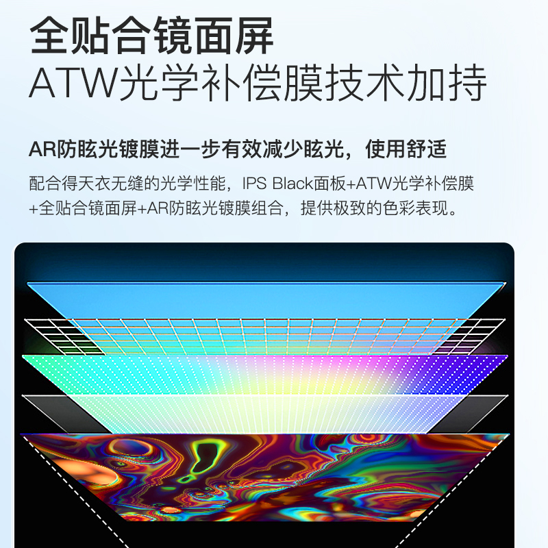 - 配备 ATW 光学补偿技术以及全贴合 AR 防眩光涂层技术