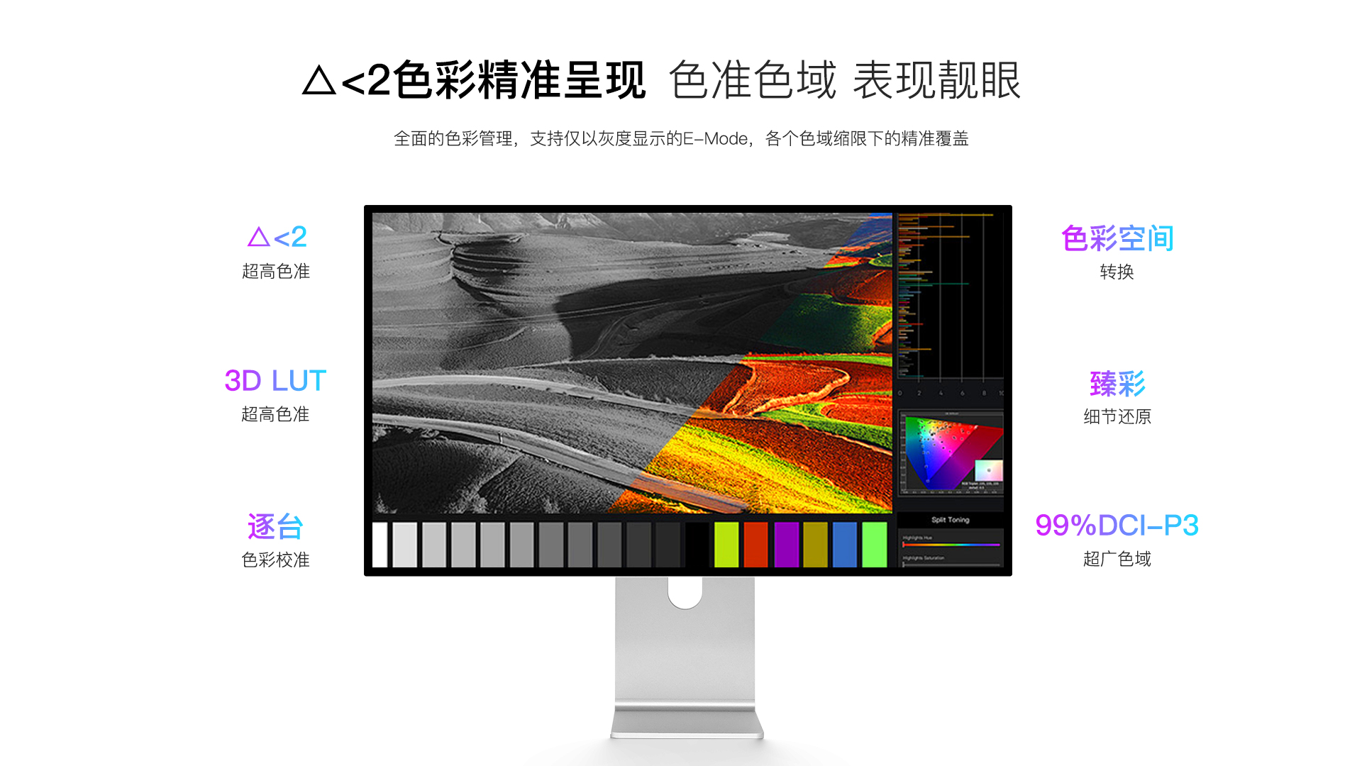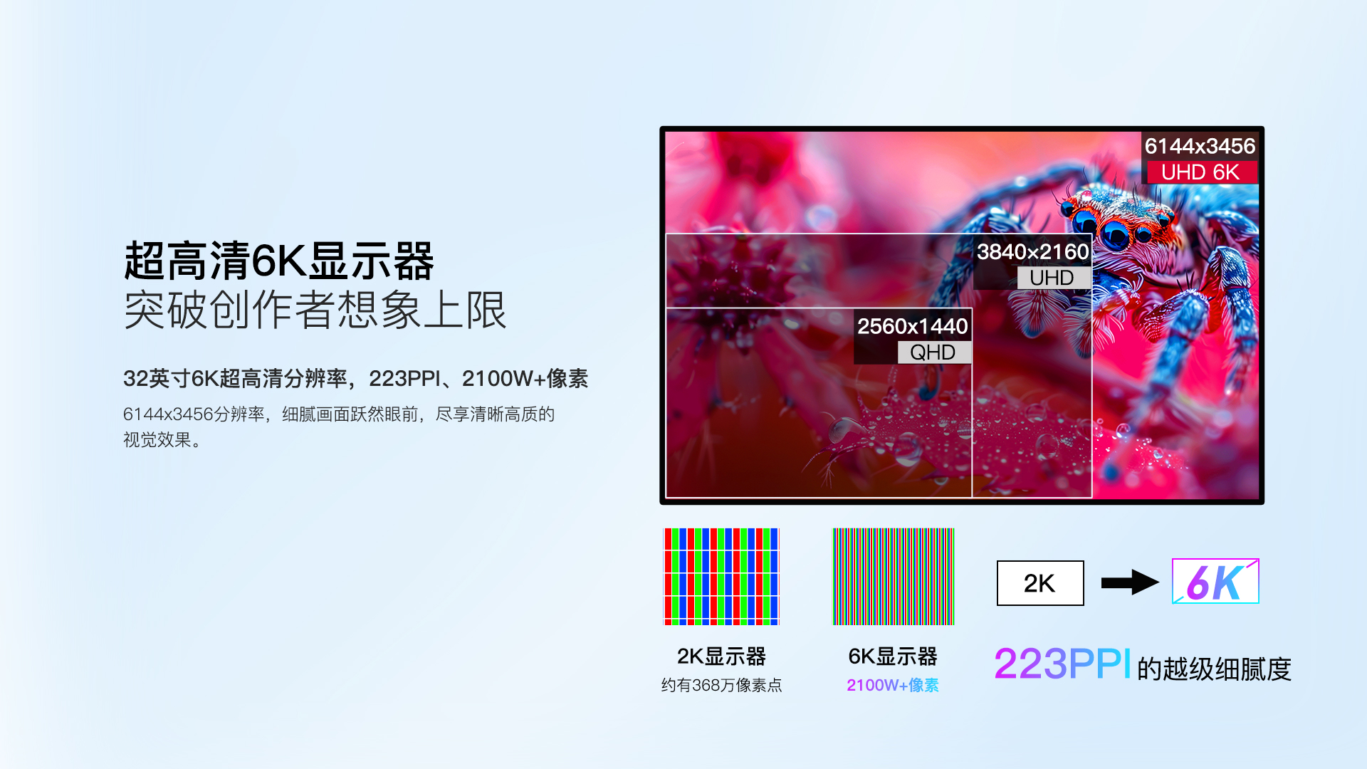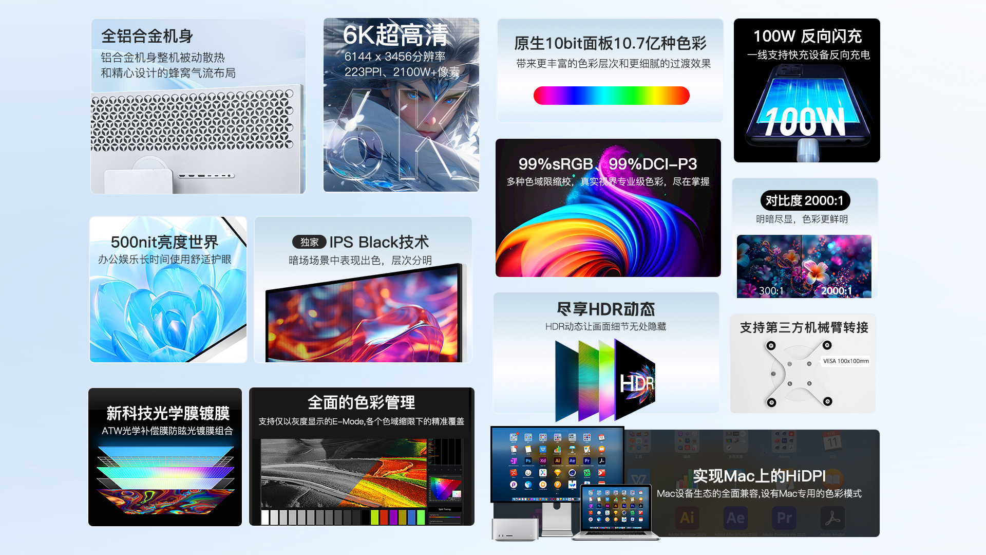 6144 x 3456 (16:9) 分辨率,高达 2100 万像素,223PPI 原生 10 位色深