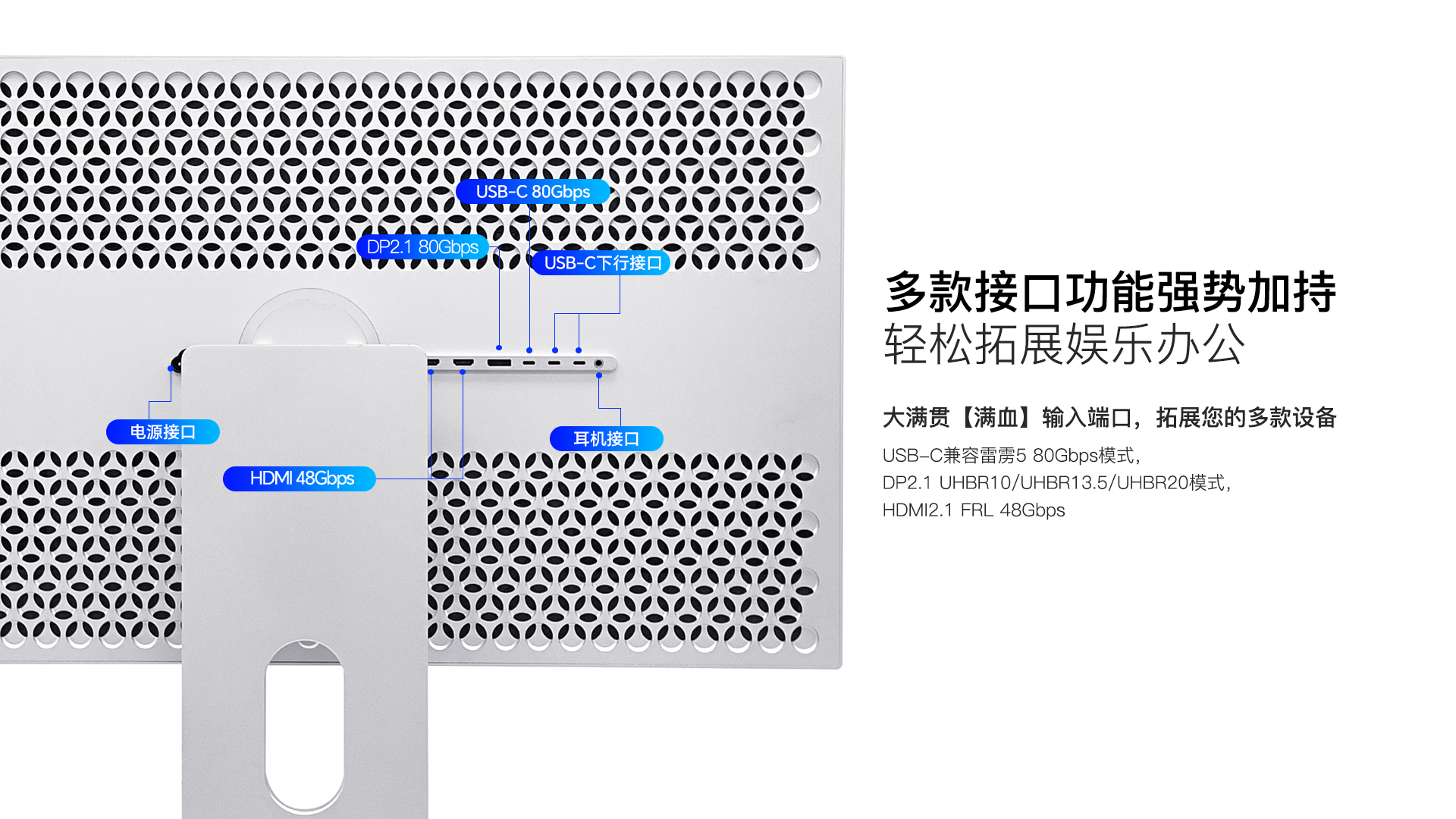 - USB Type-C 80Gbps 和 HDMI2.1 48Gbps 和 DisplayPort2.1 80Gbps 的数字连接。
