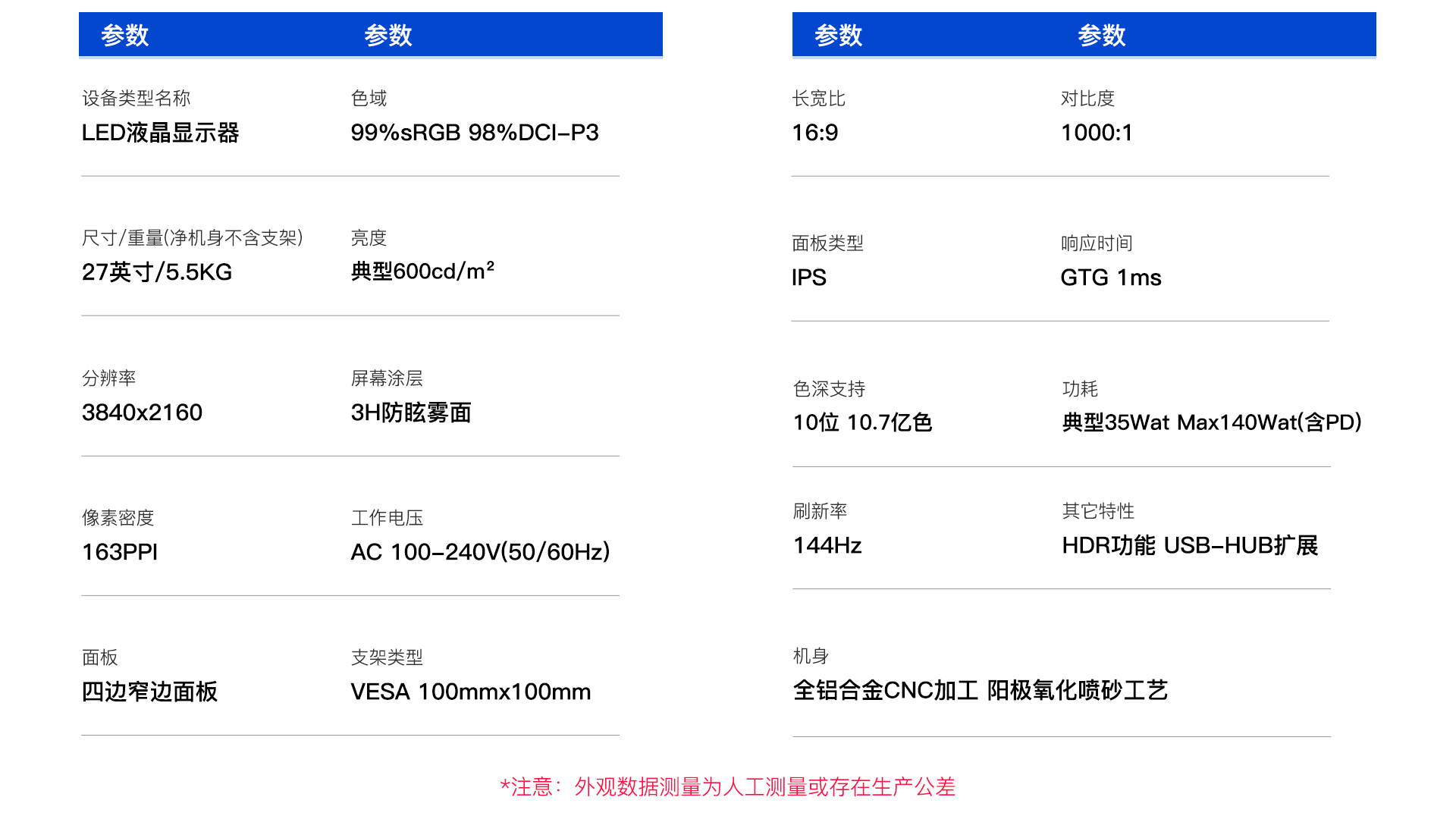 - 显示色域范围 99% sRGB 99%DCI-P3