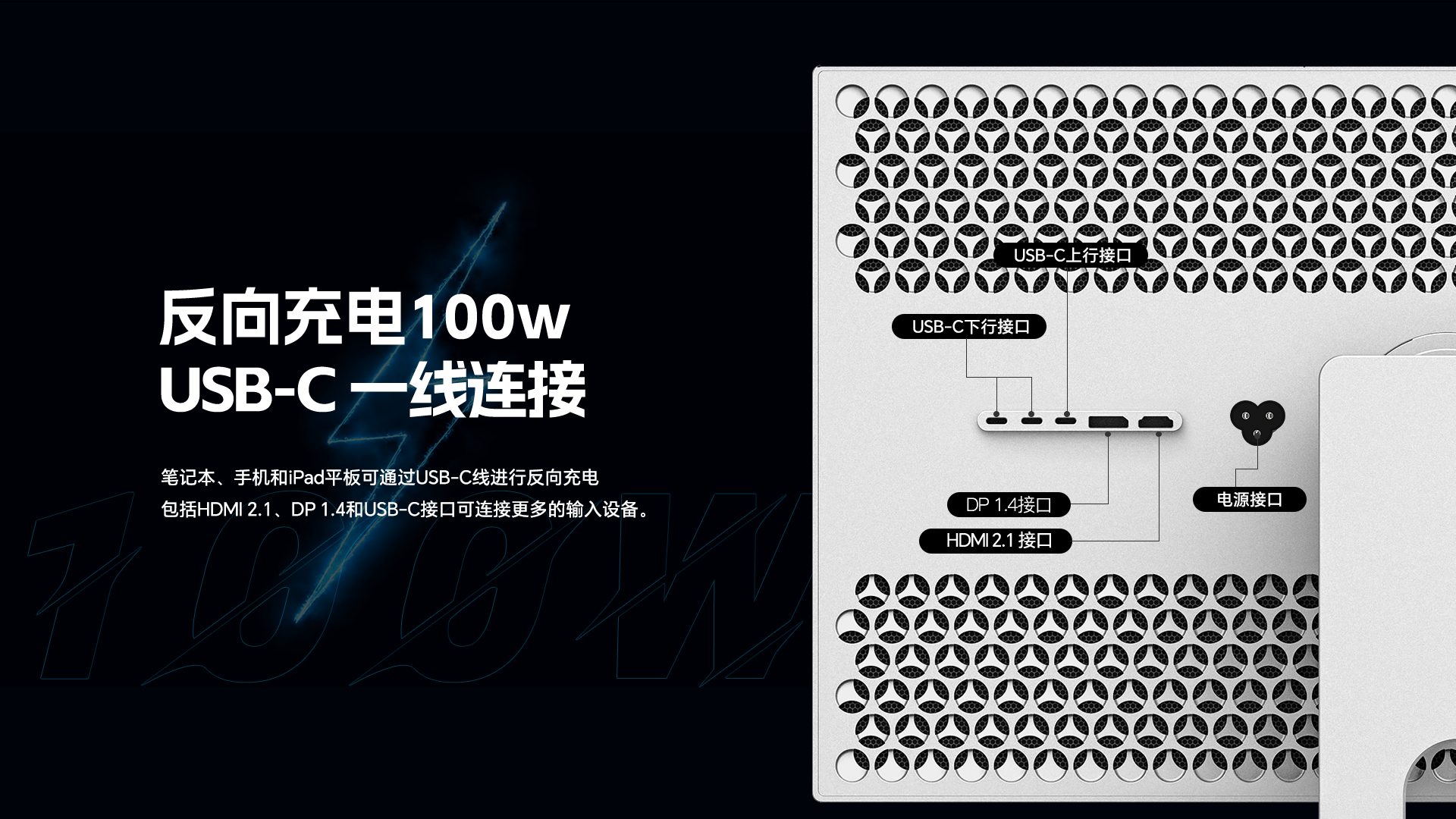 (最大 100W)同时接收视频和数据信号,并兼容 Thunderbolt 雷电 4/5/USB4